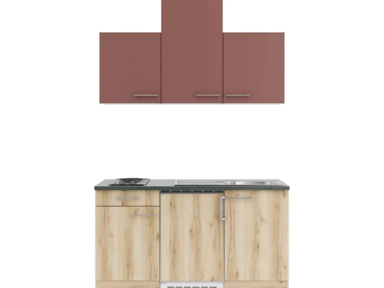 Die Serie Bari407/Livorno290 ist mit der Kombination aus Frontfarbe in Rostrot / Wildeiche Nachbildung mit Korpus in Wildeiche Nachbildung und Arbeitsplatte in Anthrazit perfekt abgestimmt. Metallgriffe in Edelstahl-Optik runden den Look ab und machen Ihre Küche zu einem echten Hingucker.