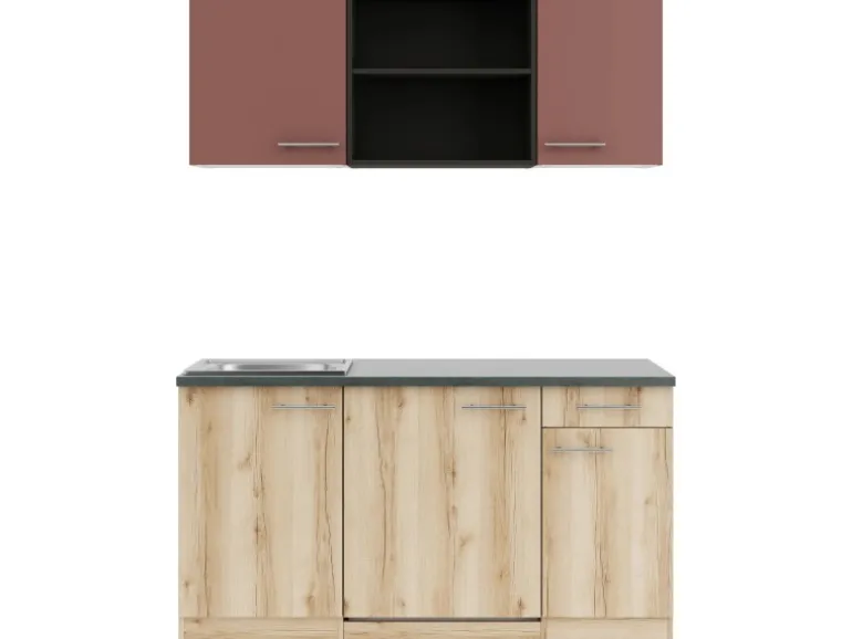 Die Serie Bari407/Livorno290 ist mit der Kombination aus Frontfarbe in Rostrot / Wildeiche Nachbildung mit Korpus inWildeiche Nachbildung und Arbeitsplatte in Anthrazit perfekt abgestimmt. Metallgriffe in Edelstahl-Optik runden den Look ab und machen auch den kleinsten Raum mit dieser Küche zu einem Hingucker.