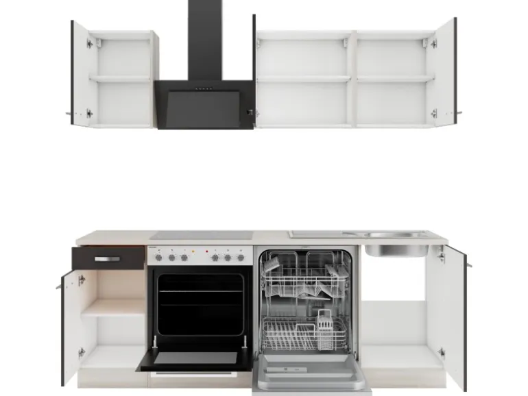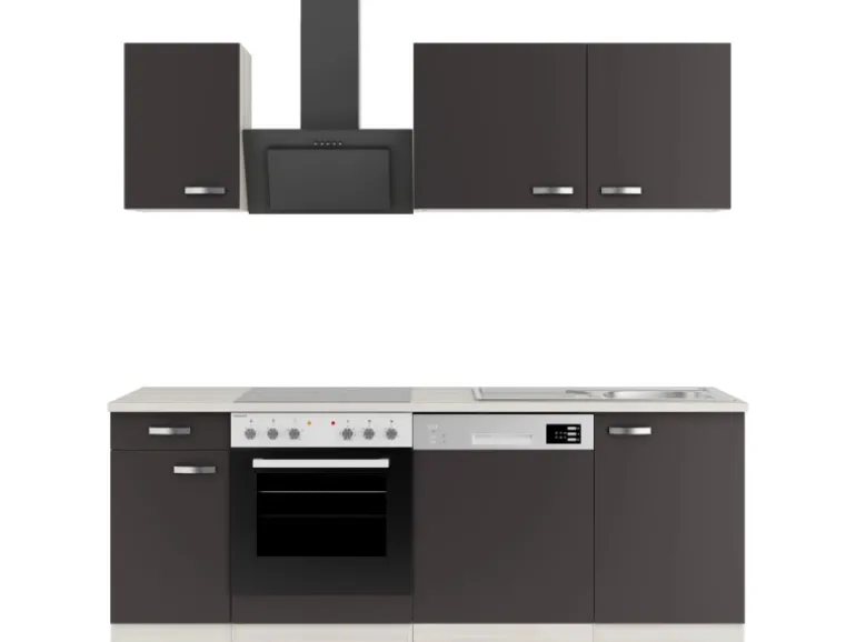 Die Serie Faro220 ist mit der Kombination aus Frontfarbe in Anthrazit mit Korpus und Arbeitsplatte in Akazie Nachbildung perfekt abgestimmt. Die gebürsteten Metallgriffe runden den Look ab und machen Ihre Küche zu einem echten Hingucker.