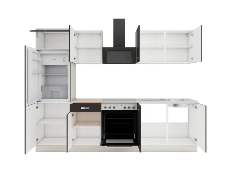 Aufbau- und Montagematerial sind im Lieferumfang enthalten. Die Küchenzeile wird zur Selbstmontage geliefert. Die Arbeitsplatte ist nicht zugesägt.