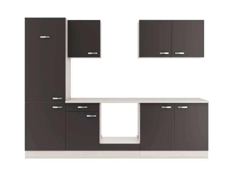 Die Serie Faro220 ist mit der Kombination aus Frontfarbe in Anthrazit mit Korpus und Arbeitsplatte in Akazie Nachbildung perfekt abgestimmt. Die gebürsteten Metallgriffe runden den Look ab und machen Ihre Küche zu einem echten Hingucker.