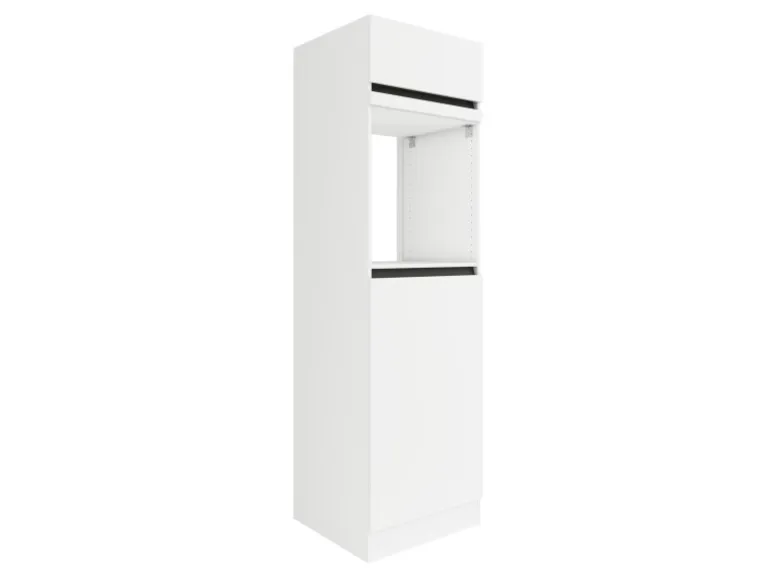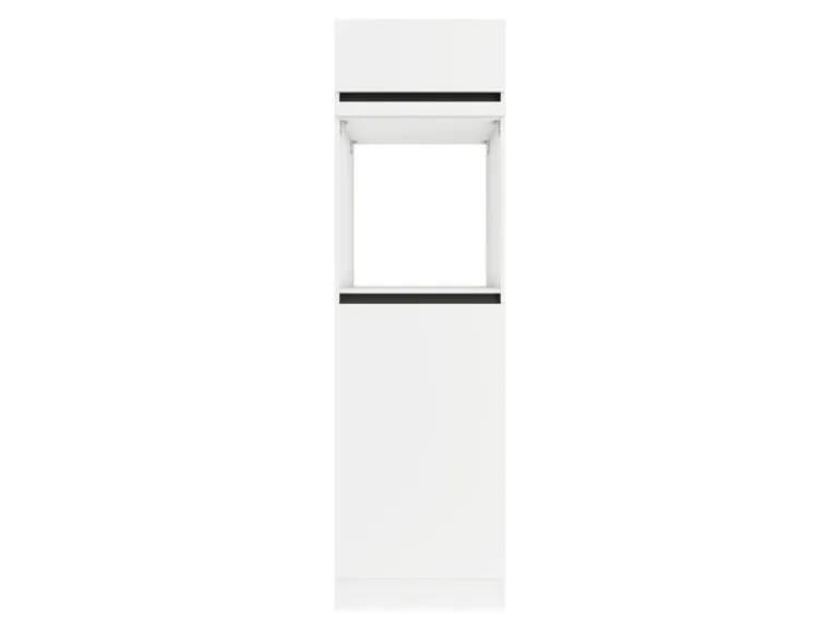 Dieser Hochschrank in Weiß bietet nicht nur Platz für einen Backofen und einen integrierbaren Kühlschrank, sondern besitzt auch ein Fach mit extra Stauraum oberhalb des Backofens.