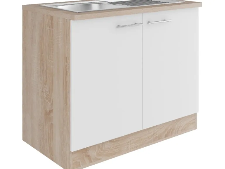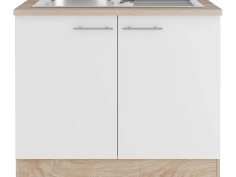 Ausstattung: 2 Drehtüren, 1 Mittelpfosten, 2 Griffe, 1 Arbeitsplatte 100 cm/ 28 mm