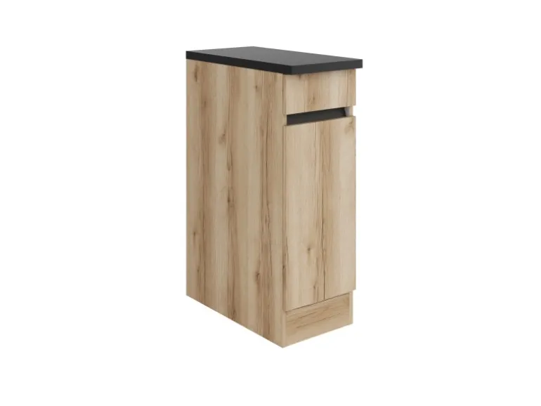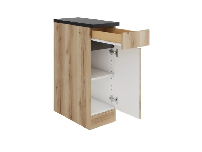 Durch die Kombination von Schubkasten und einfachem Schrank, bietet dieser Schrank in Farbe Wildeiche Nachbildung unterschiedliche Stauflächen für die weit variierenden Gegenstände in der Küche.