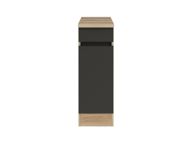 Durch die Kombination von Schubkasten und einfachem Schrank, bietet dieser Schrank in der Farbe Anthrazit-Wildeiche Nachbildung unterschiedliche Stauflächen für die weit variierenden Gegenstände in der Küche.