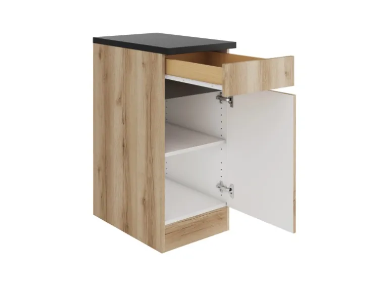Durch die Kombination von Schubkasten und einfachem Schrank, bietet dieser Schrank in Wildeiche Nachbildung unterschiedliche Stauflächen für die weit variierenden Gegenstände in der Küche.
