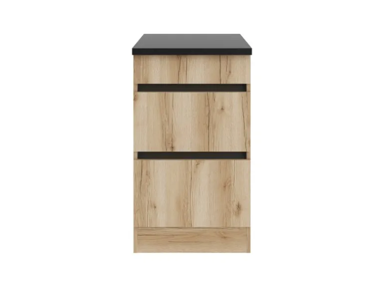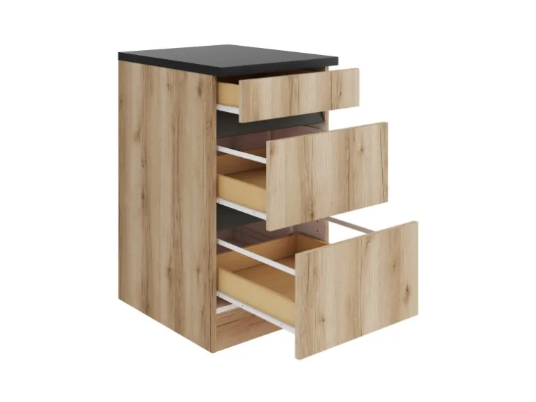 Durch die drei Auszüge bietet dieser Schrank, in Farbe Wildeiche Nachbildung, komfortabel nutzbare Stauflächen für Ihre Küche.