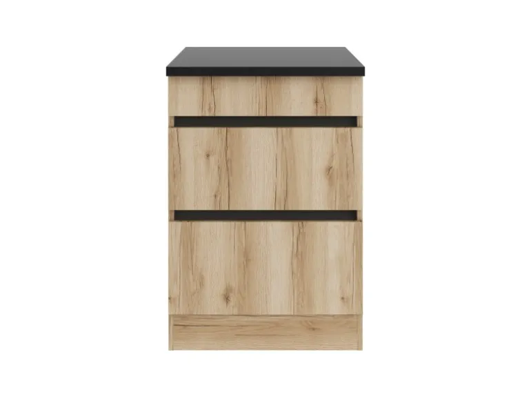 Durch die drei Auszüge bietet dieser Schrank in Farbe Wildeiche Nachbildung komfortabel nutzbare Stauflächen für Ihre Küche.