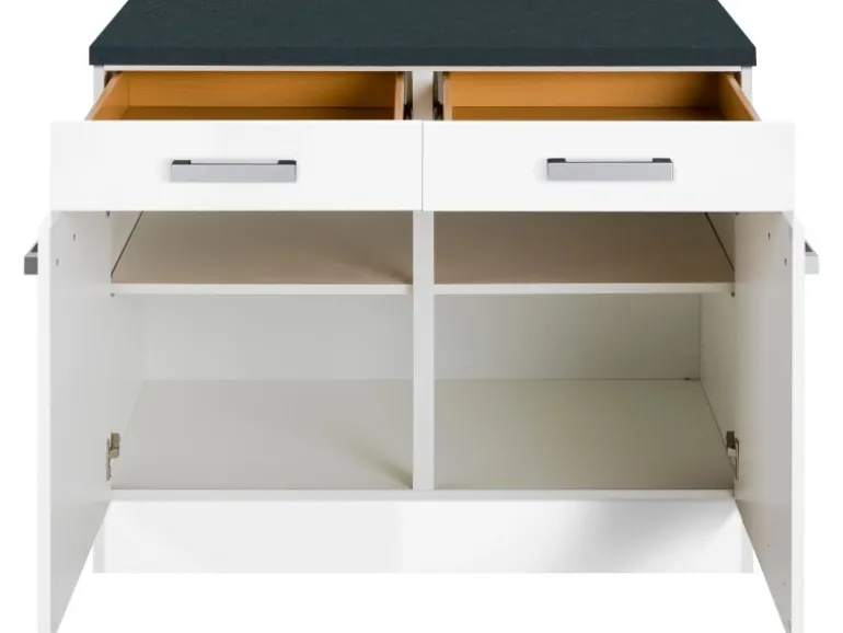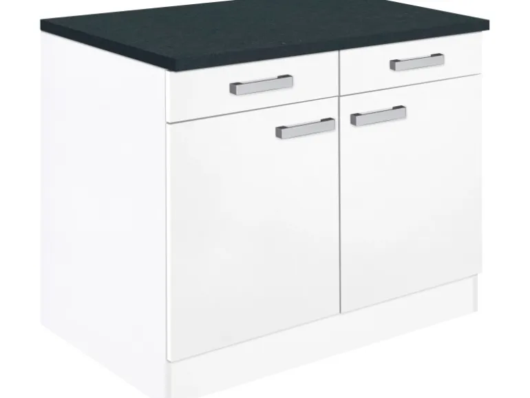 Ausstattung: 2 Schubkästen, 2 Drehtüren, 4 Griffe, 1 Arbeitsplatte 100 cm/ 28 mm