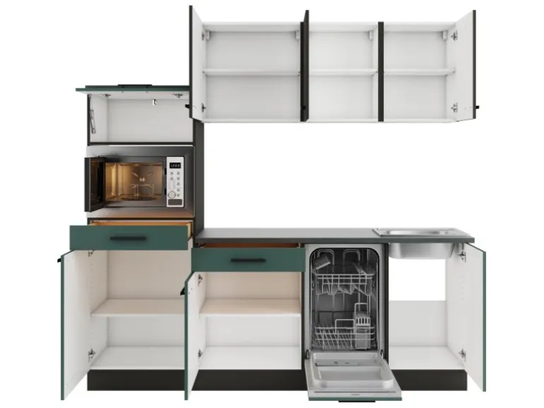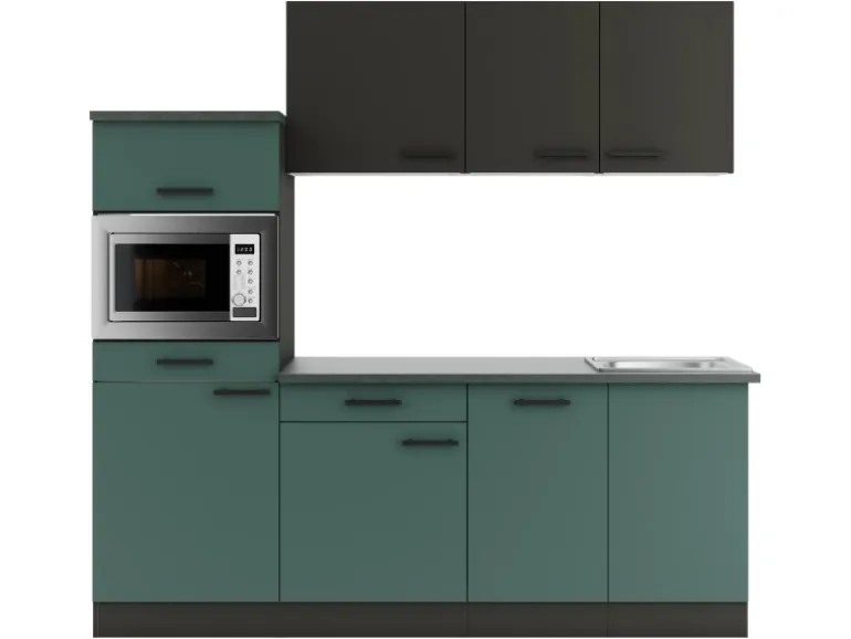 Die Serie Madrid420/Verona405 ist mit der Kombination aus Frontfarbe in Anthrazit Matt / Steingrün mit Korpus und Arbeitsplatte in Anthrazit Matt perfekt abgestimmt. Metallgriffe in Schwarz Matt runden den Look ab und machen Ihre Küche zu einem echten Hingucker.