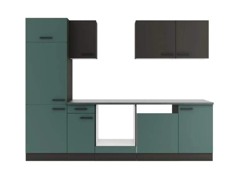 Die Serie Madrid420/Verona405 ist mit der Kombination aus Frontfarbe in Anthrazit Matt / Steingrün mit Korpus und Arbeitsplatte in Anthrazit Matt perfekt abgestimmt. Metallgriffe in Schwarz Matt runden den Look ab und machen Ihre Küche zu einem echten Hingucker.