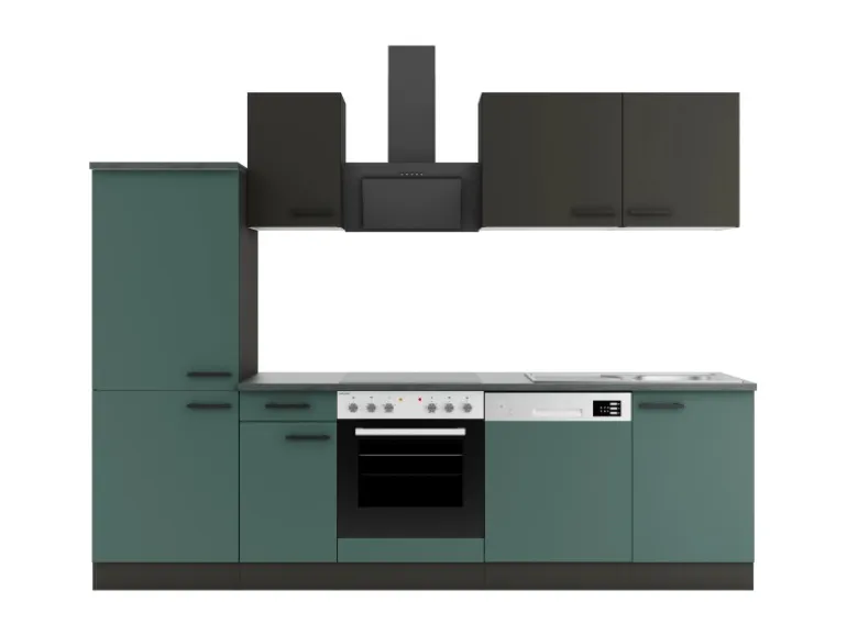 Die Serie Madrid420/Verona405 ist mit der Kombination aus Frontfarbe in Anthrazit Matt / Steingrün mit Korpus und Arbeitsplatte in Anthrazit Matt perfekt abgestimmt. Metallgriffe in Schwarz Matt runden den Look ab und machen Ihre Küche zu einem echten Hingucker.