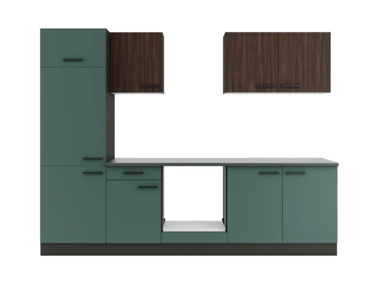 Die Serie Rimini409/Verona405 ist mit der Kombination aus Frontfarbe in Rillendekor Nussbaum / Steingrün mit Korpus und Arbeitsplatte in Anthrazit Matt perfekt abgestimmt. Metallgriffe in Schwarz Matt runden den Look ab und machen Ihre Küche zu einem echten Hingucker.