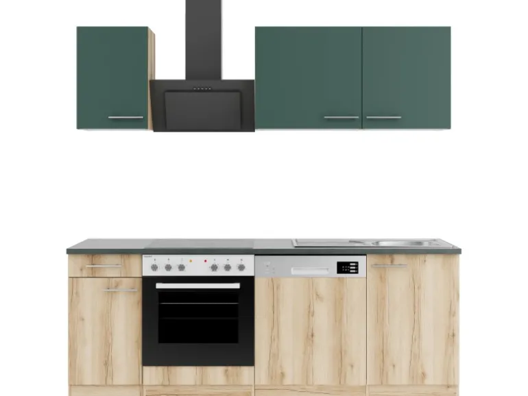 Die Serie Savona405/Livorno290 ist mit der Kombination aus Frontfarbe in Steingrün / Wildeiche Nachbildung mit Korpus Wildeiche Nachbildung und Arbeitsplatte in Anthrazit perfekt abgestimmt. Metallgriffe in Edelstahl-Optik runden den Look ab und machen Ihre Küche zu einem echten Hingucker.