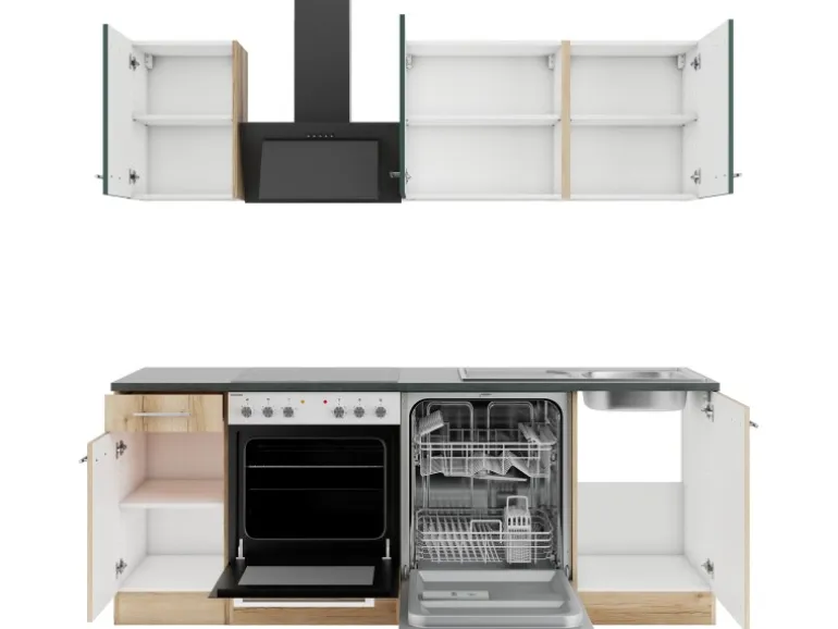 Aufbau- und Montagematerial sind im Lieferumfang enthalten. Die Küchenzeile wird zur Selbstmontage geliefert. Die Arbeitsplatte ist nicht zugesägt.