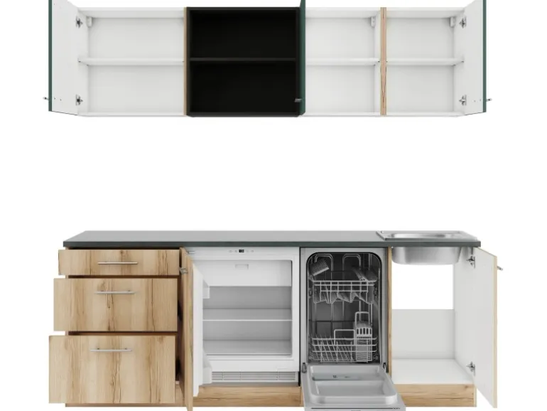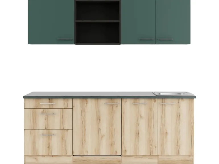 Die Serie Savona405/Livorno290 ist mit der Kombination aus Frontfarbe in Steingrün / Wildeiche Nachbildung mit Korpus Wildeiche Nachbildung und Arbeitsplatte in Anthrazit perfekt abgestimmt. Metallgriffe in Edelstahl-Optik runden den Look ab und machen Ihre Küche zu einem echten Hingucker.