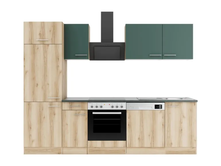 Die Serie Savona405/Livorno290 ist mit der Kombination aus Frontfarbe in Steingrün / Wildeiche Nachbildung mit Korpus Wildeiche Nachbildung und Arbeitsplatte in Anthrazit perfekt abgestimmt. Metallgriffe in Edelstahl-Optik runden den Look ab und machen Ihre Küche zu einem echten Hingucker.