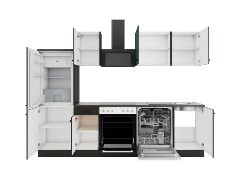Die Serie Verona405/Madrid420 ist mit der Kombination aus Frontfarbe in Steingrün / Anthrazit Matt mit Korpus und Arbeitsplatte in Anthrazit Matt perfekt abgestimmt. Metallgriffe in Schwarz Matt runden den Look ab und machen Ihre Küche zu einem echten Hingucker.