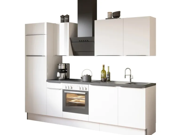 Aufbau- und Montagematerial sind im Lieferumfang enthalten. Die Küchenzeile wird zur Selbstmontage geliefert. Die Arbeitsplatte ist nicht zugesägt.