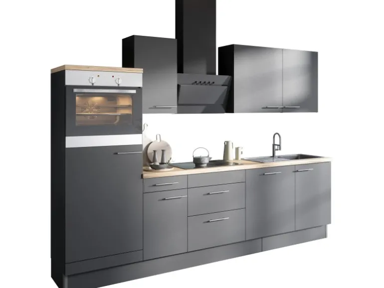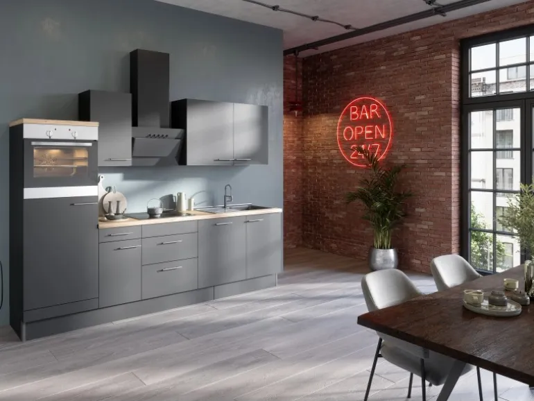 Die Arbeitsplatte in Wildeiche Nachbildung passt farblich fantastisch zu der Front- und Korpusfarbe Anthrazit. Die matten Fronten schließen mit den enthaltenen Griffen in Metall Edelstahl Optik den modernen Look der Küche ab.