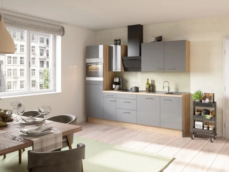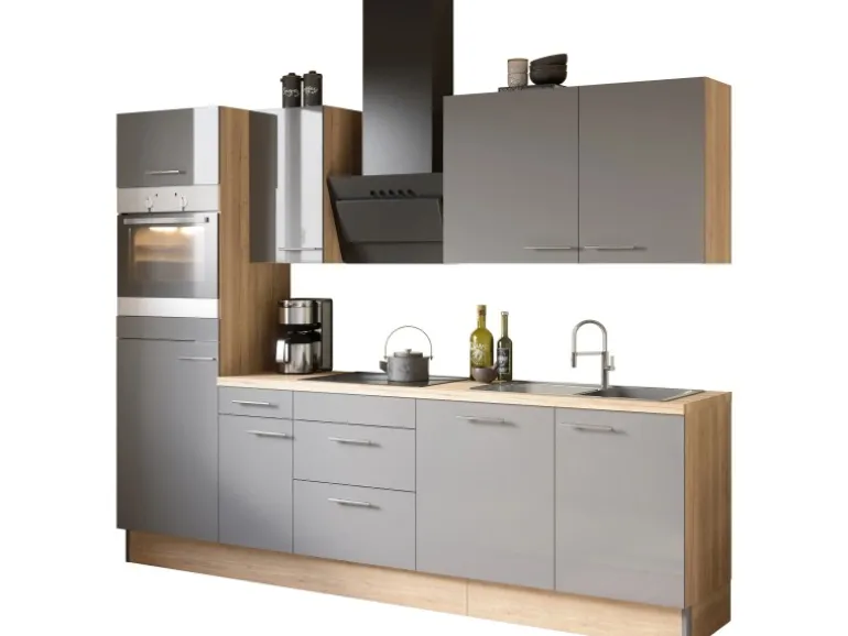 Aufbau- und Montagematerial sind im Lieferumfang enthalten. Die Küchenzeile wird zur Selbstmontage geliefert. Die Arbeitsplatte ist nicht zugesägt.