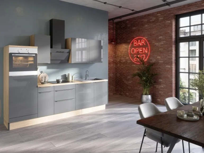 Die Arbeitsplatte und die Korpusfarbe in Wildeiche Nachbildung ist farblich fantastisch zu der Frontfarbe in Anthrazit Lack Glanz abgestimmt. Mit den enthaltenen Griffleisten in Metall Edelstahl Optik schließt die Front- Korpuskombination den modernen und frischen Look der Küche ab.