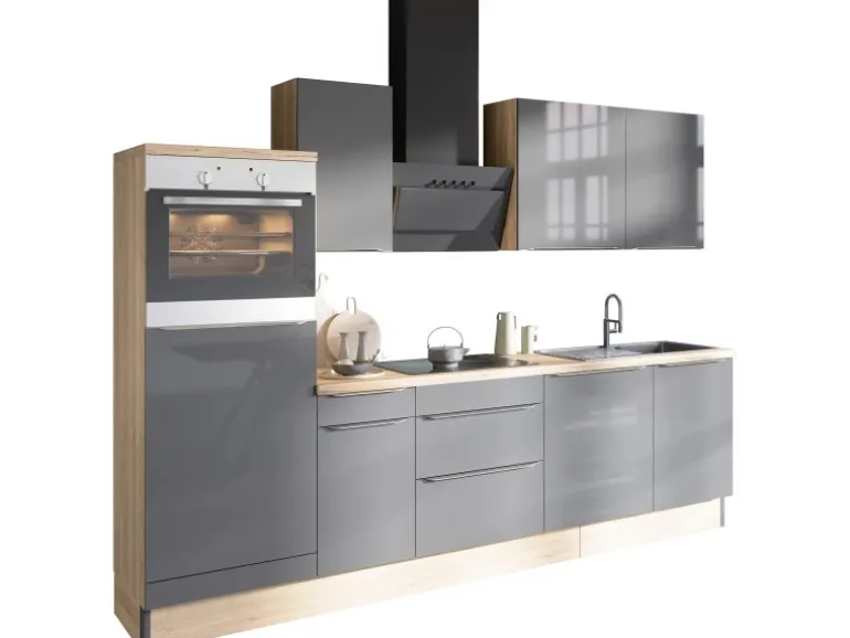 Aufbau- und Montagematerial sind im Lieferumfang enthalten. Die Küchenzeile wird zur Selbstmontage geliefert. Die Arbeitsplatte ist nicht zugesägt.