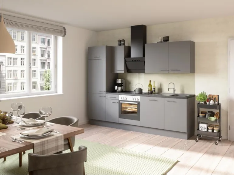 Die Front- und Korpusfarbe Basaltgrau passt farblich hervorragend zu der Arbeitsplatte in Black Stone. Die Farbkombination rundet den modernen Look mit den enthaltenen Griffen in Metall Edelstahl Optik perfekt ab.
