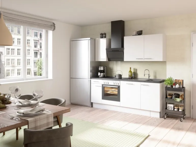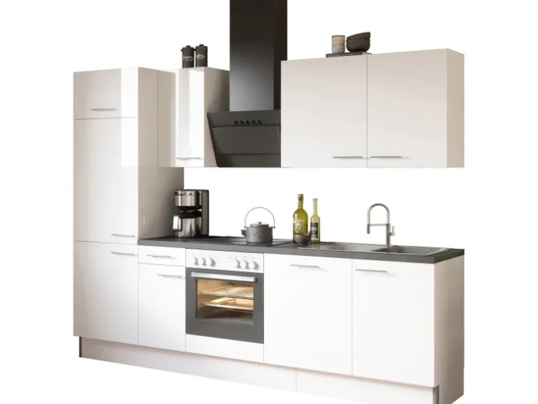 Aufbau- und Montagematerial sind im Lieferumfang enthalten. Die Küchenzeile wird zur Selbstmontage geliefert. Die Arbeitsplatte ist nicht zugesägt.