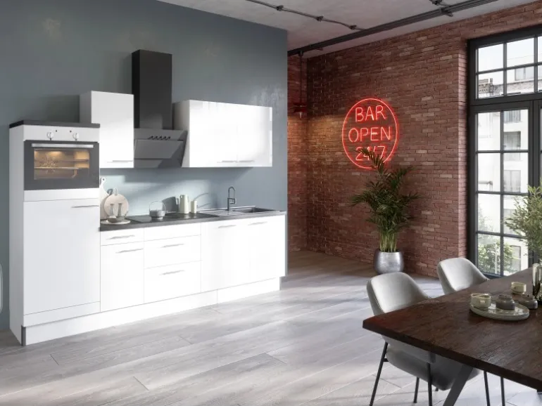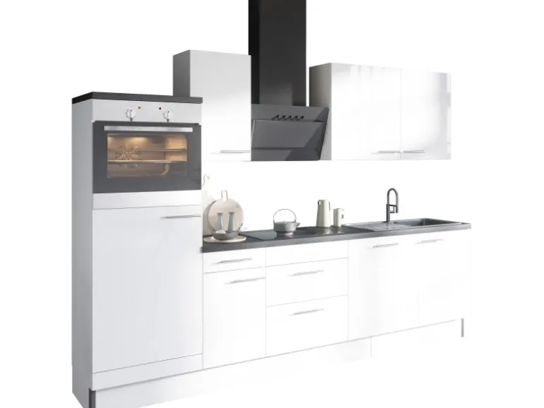 Aufbau- und Montagematerial sind im Lieferumfang enthalten. Die Küchenzeile wird zur Selbstmontage geliefert. Die Arbeitsplatte ist nicht zugesägt.