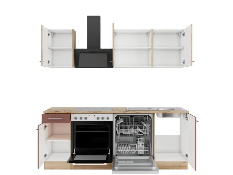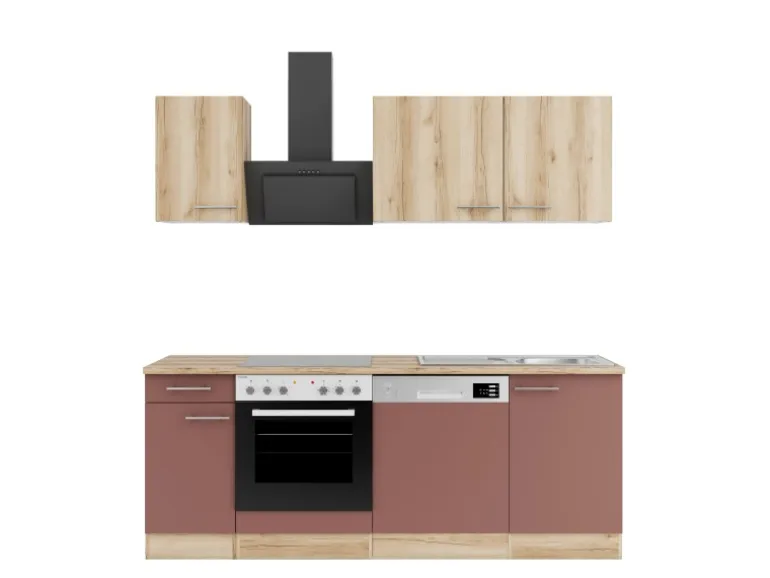 Die Serie Livorno290/Bari407 ist mit der Kombination aus Frontfarbe in Wildeiche Nachbildung / Rostrot mit Korpus und Arbeitsplatte in Wildeiche Nachbildung perfekt abgestimmt. Metallgriffe in Edelstahl-Optik runden den Look ab und machen Ihre Küche zu einem echten Hingucker.