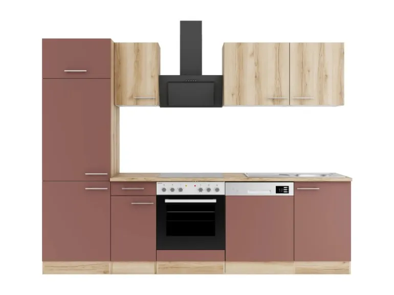 Die Serie Livorno290/Bari407 ist mit der Kombination aus Frontfarbe in Wildeiche Nachbildung / Rostrot mit Korpus und Arbeitsplatte in Wildeiche Nachbildung perfekt abgestimmt. Metallgriffe in Edelstahl-Optik runden den Look ab und machen Ihre Küche zu einem echten Hingucker.