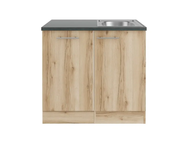 Die Serie Livorno290 ist mit der Kombination aus Front- und KorpusfarbeWildeiche Nachbildung und Arbeitsplatte in Anthrazitperfekt abgestimmt. Metallgriffe in Edelstahl-Optik runden den Look ab und machen Ihre Küche zu einem echten Hingucker.