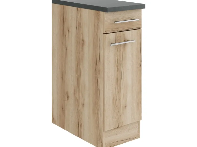Die Serie Livorno290 ist mit der Kombination aus Front- und KorpusfarbeWildeiche Nachbildung und Arbeitsplatte in Anthrazitperfekt abgestimmt. Metallgriffe in Edelstahl-Optik runden den Look ab und machen Ihre Küche zu einem echten Hingucker.