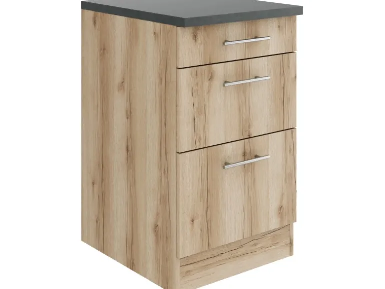 Die Serie Livorno290 ist mit der Kombination aus Front- und KorpusfarbeWildeiche Nachbildung und Arbeitsplatte in Anthrazitperfekt abgestimmt. Metallgriffe in Edelstahl-Optik runden den Look ab und machen Ihre Küche zu einem echten Hingucker.