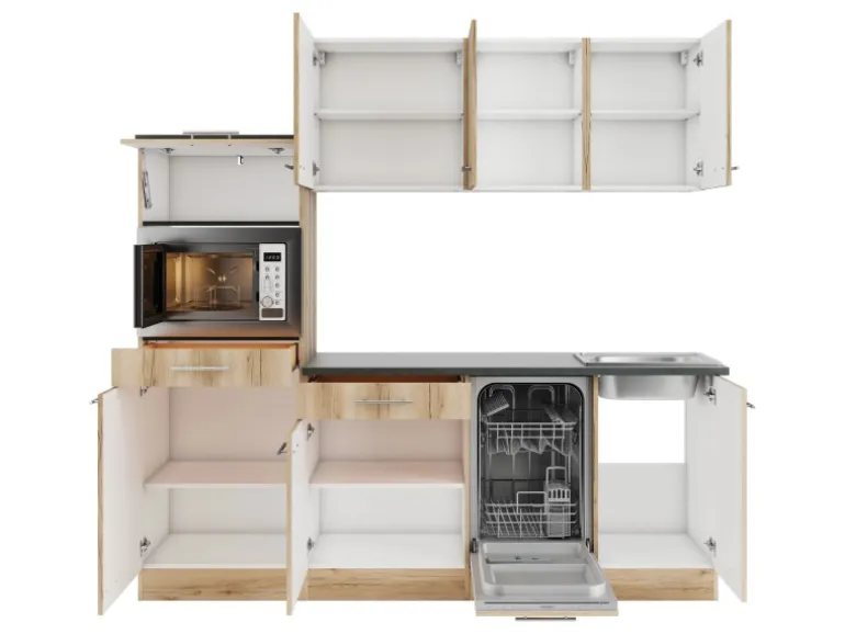 Aufbau- und Montagematerial sind im Lieferumfang enthalten. Die Küchenzeile wird zur Selbstmontage geliefert. Die Arbeitsplatte ist nicht zugesägt.