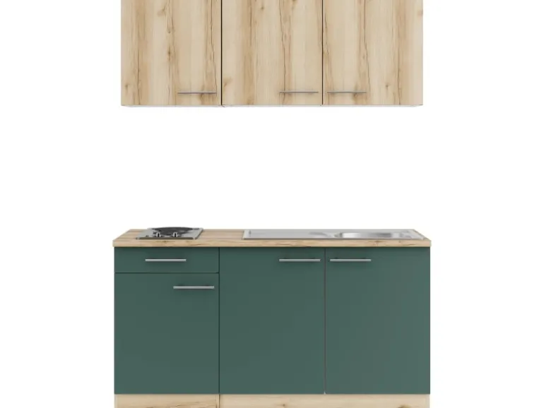 Die Serie Livorno290/Savona405 ist mit der Kombination aus Frontfarbe in Wildeiche Nachbildung / Steingrün mit Korpus und Arbeitsplatte in Wildeiche Nachbildung perfekt abgestimmt. Metallgriffe in Edelstahl-Optik runden den Look ab und machen auch den kleinsten Raum mit dieser Küche zu einem Hingucker.