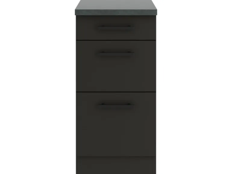 Die Serie Madrid420 ist mit der Kombination aus Front- und KorpusfarbeAnthrazit Matt und Arbeitsplatte in Anthrazitperfekt abgestimmt. Metallgriffe in Schwarz Matt runden den Look ab und machen Ihre Küche zu einem echten Hingucker.