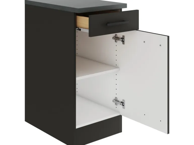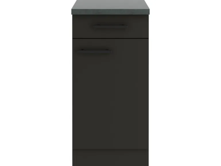 Die Serie Madrid420 ist mit der Kombination aus Front- und KorpusfarbeAnthrazit Matt und Arbeitsplatte in Anthrazitperfekt abgestimmt. Metallgriffe in Schwarz Matt runden den Look ab und machen Ihre Küche zu einem echten Hingucker.