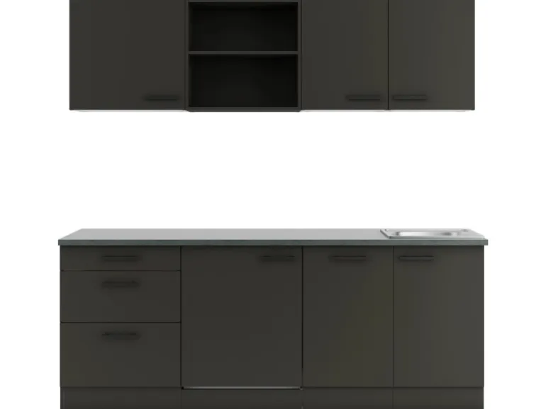 Die Serie Madrid420 ist mit der Kombination aus Front- und KorpusfarbeAnthrazit Matt und Arbeitsplatte in Anthrazit Matt perfekt abgestimmt. Metallgriffe in Schwarz Matt runden den Look ab und machen Ihre Küche zu einem echten Hingucker.