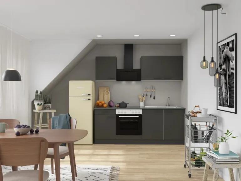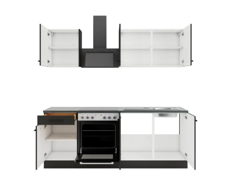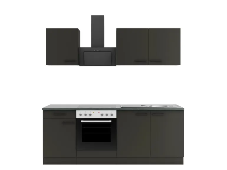 Die Serie Madrid420 ist mit der Kombination aus Front- und KorpusfarbeAnthrazit Matt und Arbeitsplatte in Anthrazit Matt perfekt abgestimmt. Metallgriffe in Schwarz Matt runden den Look ab und machen Ihre Küche zu einem echten Hingucker.