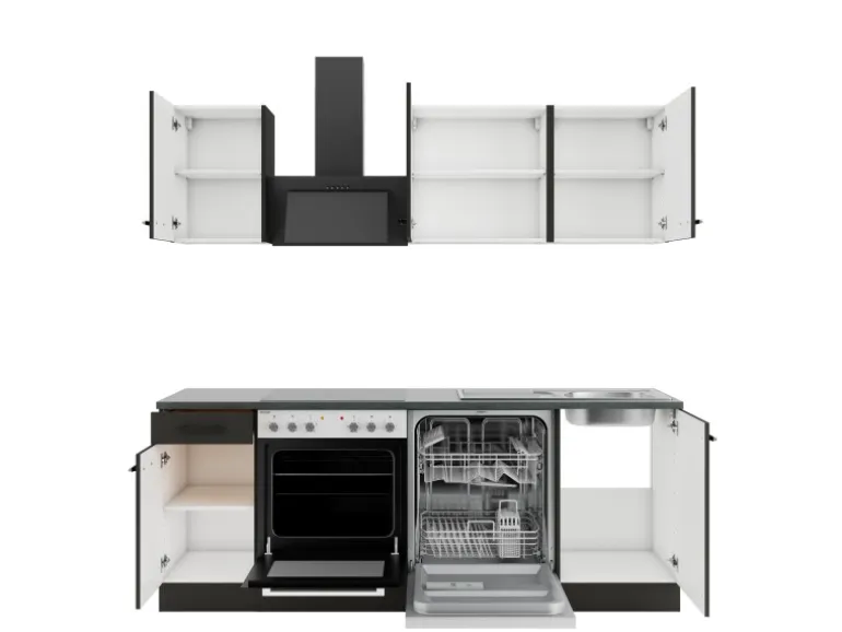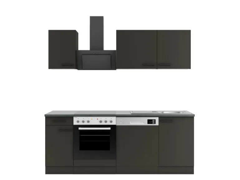 Die Serie Madrid420 ist mit der Kombination aus Front- und KorpusfarbeAnthrazit Matt und Arbeitsplatte in Anthrazit Matt perfekt abgestimmt. Metallgriffe in Schwarz Matt runden den Look ab und machen Ihre Küche zu einem echten Hingucker.