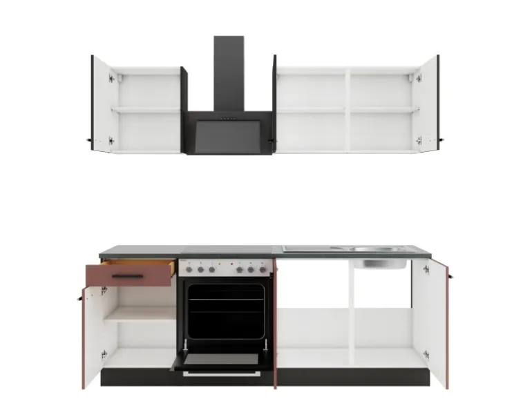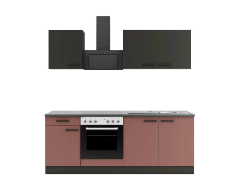 Die Serie Madrid420/Nizza407 ist mit der Kombination aus Frontfarbe in Anthrazit Matt / Rostrot mit Korpus und Arbeitsplatte in Anthrazit Matt perfekt abgestimmt. Metallgriffe in Schwarz Matt runden den Look ab und machen Ihre Küche zu einem echten Hingucker.