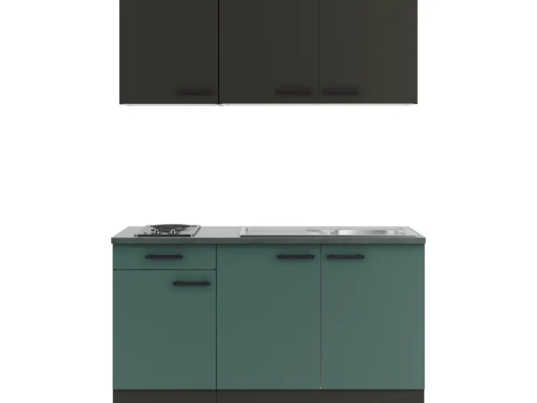 Die Serie Madrid420/Verona405 ist mit der Kombination aus Frontfarbe in Anthrazit Matt / Steingrün mit Korpus und Arbeitsplatte in Anthrazit Matt perfekt abgestimmt. Metallgriffe in Schwarz Matt runden den Look ab und machen auch den kleinsten Raum mit dieser Küche zu einem Hingucker.
