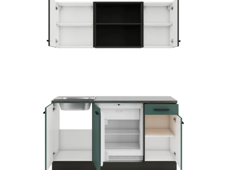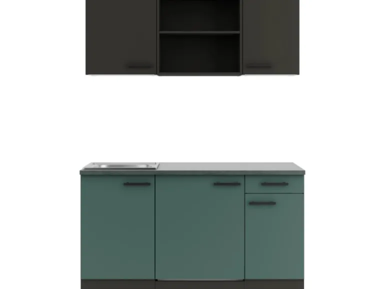 Die Serie Madrid420/Verona405 ist mit der Kombination aus Frontfarbe in Anthrazit Matt / Steingrün mit Korpus und Arbeitsplatte in Anthrazit Matt perfekt abgestimmt. Metallgriffe in Schwarz Matt runden den Look ab und machen auch den kleinsten Raum mit dieser Küche zu einem Hingucker.