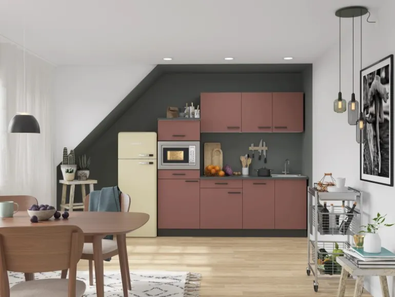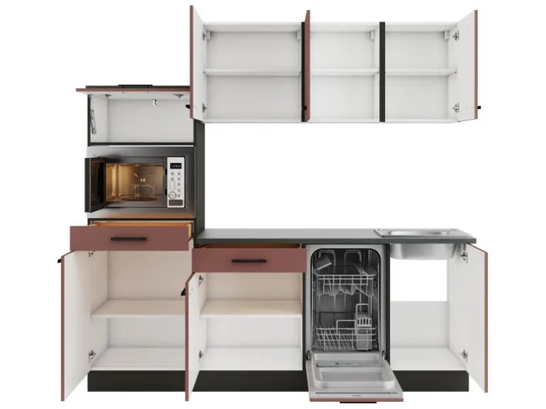 Die Serie Nizza407 ist mit der Kombination aus Frontfarbe in Rostrot mit Korpus und Arbeitsplatte in Anthrazit Matt perfekt abgestimmt. Metallgriffe in Schwarz Matt runden den Look ab und machen Ihre Küche zu einem echten Hingucker.