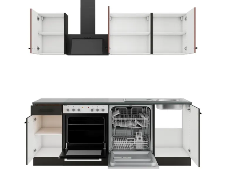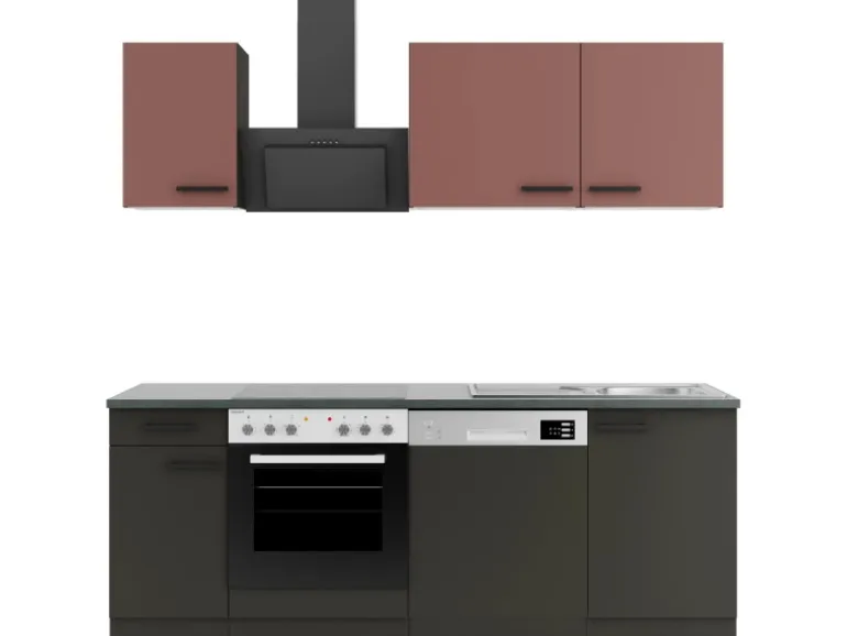 Die Serie Nizza407/Madrid420 ist mit der Kombination aus Frontfarbe in Rostrot / Anthrazit Matt mit Korpus und Arbeitsplatte in Anthrazit Matt perfekt abgestimmt. Metallgriffe in Schwarz Matt runden den Look ab und machen Ihre Küche zu einem echten Hingucker.
