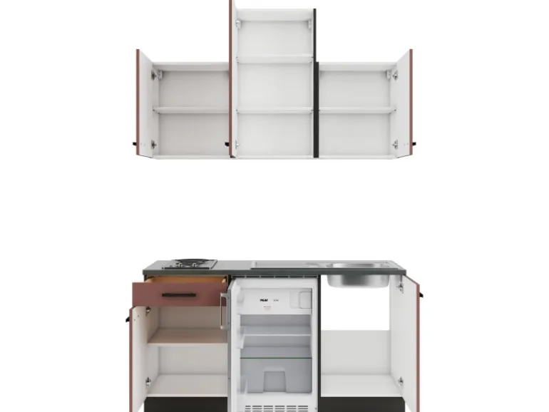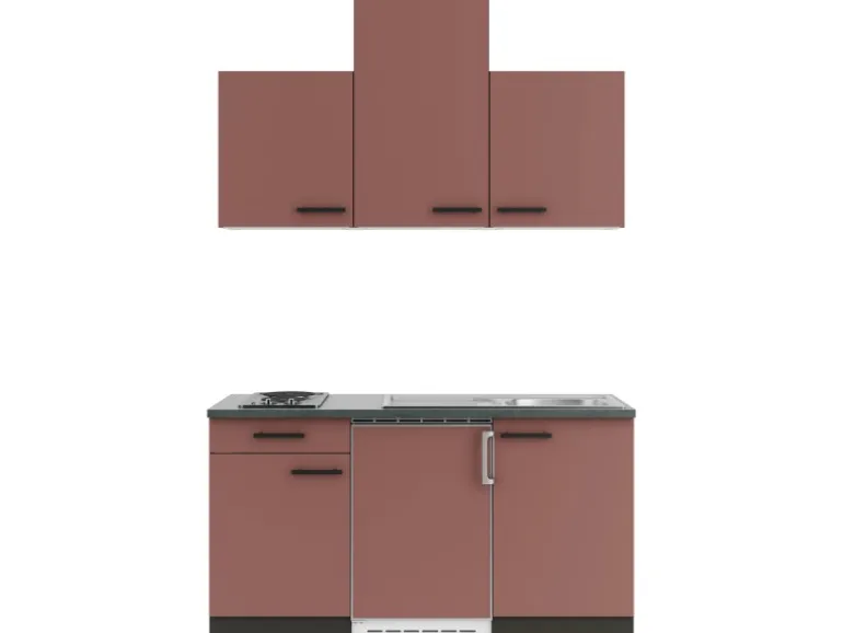 Die Serie Nizza407 ist mit der Kombination aus Frontfarbe in Rostrot mit Korpus und Arbeitsplatte in Anthrazit Matt perfekt abgestimmt. Metallgriffe in Schwarz Matt runden den Look ab und machen Ihre Küche zu einem echten Hingucker.
