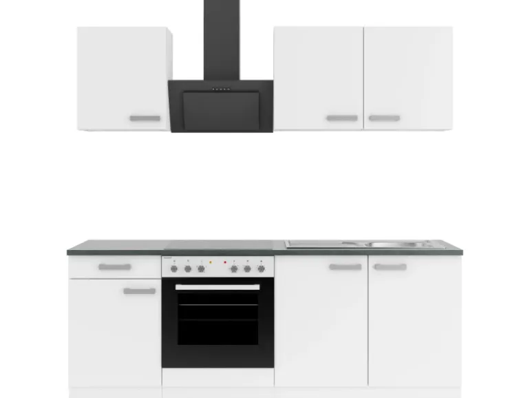 Die Serie Oslo214 ist mit der Kombination aus Frontfarbe Feinstruktur Weiß, Korpus in Weiß und Arbeitsplatte in Anthrazit perfekt abgestimmt. Griffe in Alu-Optik runden den Look ab und machen Ihre Küche zu einem echten Hingucker.