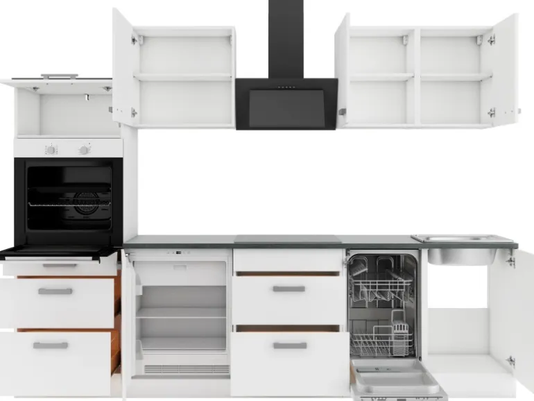 Aufbau- und Montagematerial sind im Lieferumfang enthalten. Die Küchenzeile wird zur Selbstmontage geliefert. Die Arbeitsplatte ist nicht zugesägt.